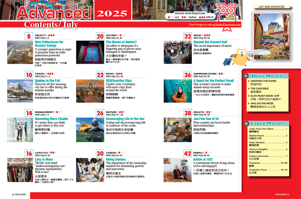 - 提供雜誌閱讀模式與互動學習模式、每日課文講解及朗讀、難易度標示、語速調整、中英雙語同步閱讀